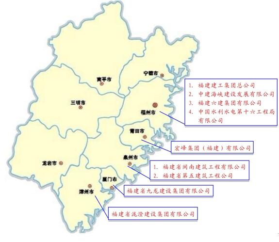 福州共4家,分別為:1.福建建工集團(tuán)總公司,2.中建海峽建設(shè)發(fā)展有限公司,3.福建六建集團(tuán)有限公司,4.中國(guó)水利水電第十六工程局有限公司(水利水電工程);